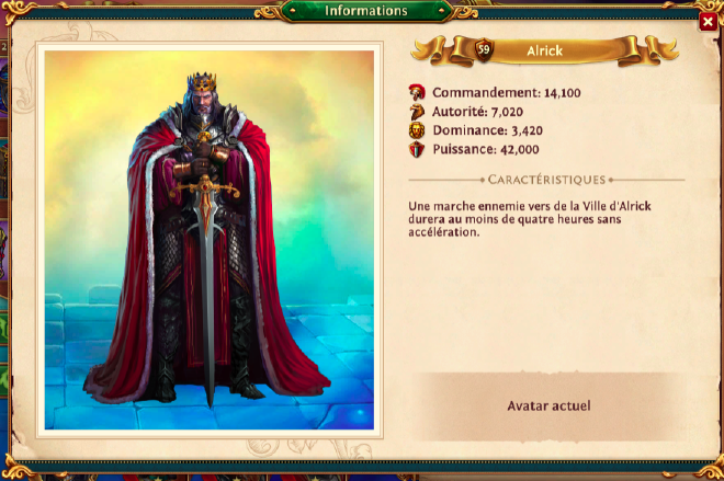 Aujourd’hui, Alrick est mon général incontournable. Véritable mur défensif, il protège ma cité contre toutes les attaques ennemies. Même avec les accélérateurs, une marche vers sa ville prend 7 minutes, ce qui témoigne de sa robustesse et de son rôle central dans mes stratégies défensives.